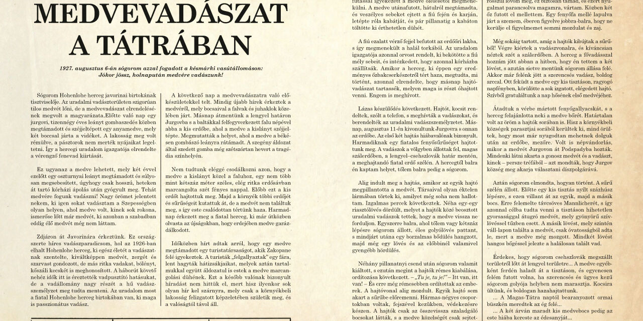 Sógorom Hohenlohe herceg javorinai birtokának tisztviselője. Az uradalmi vadászterületen szigorúan tilos medvét lőni, de a medvevadászat elrendelésének megvolt a magyarázata.Előtte való nap egy jurgovi, tizennégy éves leányt gombaszedés közben megtámadott és széjjeltépett egy anyamedve, mely két boccsal járta a vidéket. A lakosság meg volt rémülve, a pásztorok nem merték nyájaikat legeltetni. Így a hercegi uradalom igazgatója elrendelte a vérengző fenevad kiirtását.
